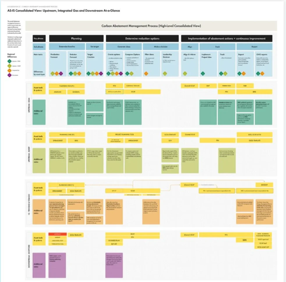 Shell's GHG management tool was used across hundreds of assets worldwide, but nobody had a clear view of the process it was supposed to support. When the team started looking at replacing it, that gap became the actual problem to solve. In two weeks, we ran 8 stakeholder interviews, 3 technical calls, and a two-part remote workshop with 18 people from Europe, the Americas, and Asia. I designed the digital boards, shaped the agenda, facilitated both sessions, and led the synthesis. What came out of it was a consolidated process map that showed, for the first time, not just how the process worked but where and why it differed across regions. Teams that had been working in isolation could suddenly see each other's processes side by side. For leadership, it made visible something that had been difficult to articulate — and gave them a clear place to start.