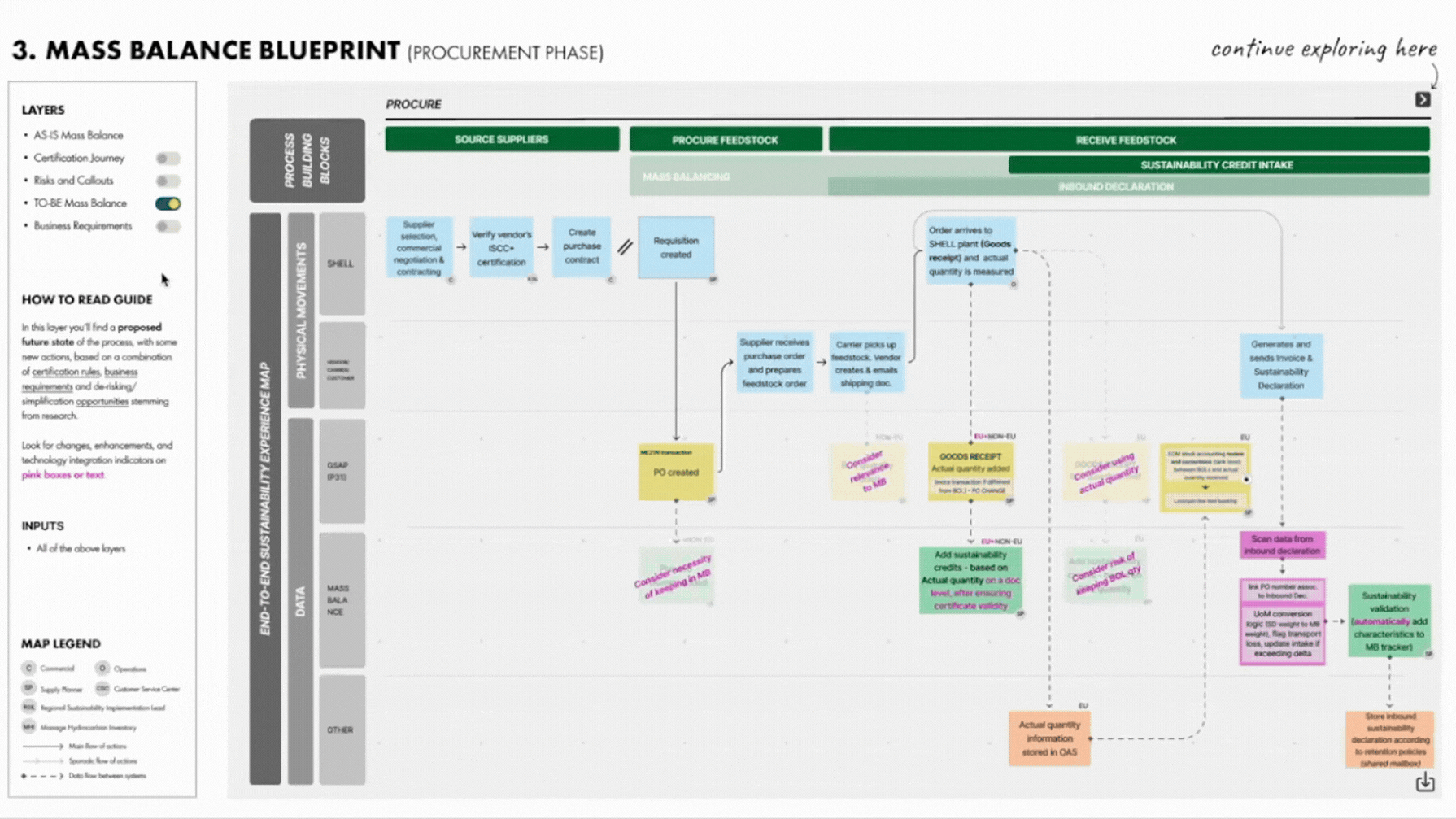Shell Chemicals was scaling its sustainable feedstock operations — sourcing and selling materials certified under schemes like ISCC, and tracking sustainability credits across the full procurement and production cycle. The mass balance process that underpins all of this is genuinely complex: certification rules, regional variation, data moving between systems, and audit requirements that don't leave much room for error. Before the team could scope a new digital solution, they needed to understand what was actually happening. We built a due diligence toolkit that mapped the process end to end — AS-IS and TO-BE states, data flows, certification rules, risk callouts, and a prioritization matrix to guide decisions about what the solution needed to cover first. It gave the team a shared, visual understanding of where the risks were and what the minimum viable scope actually looked like.