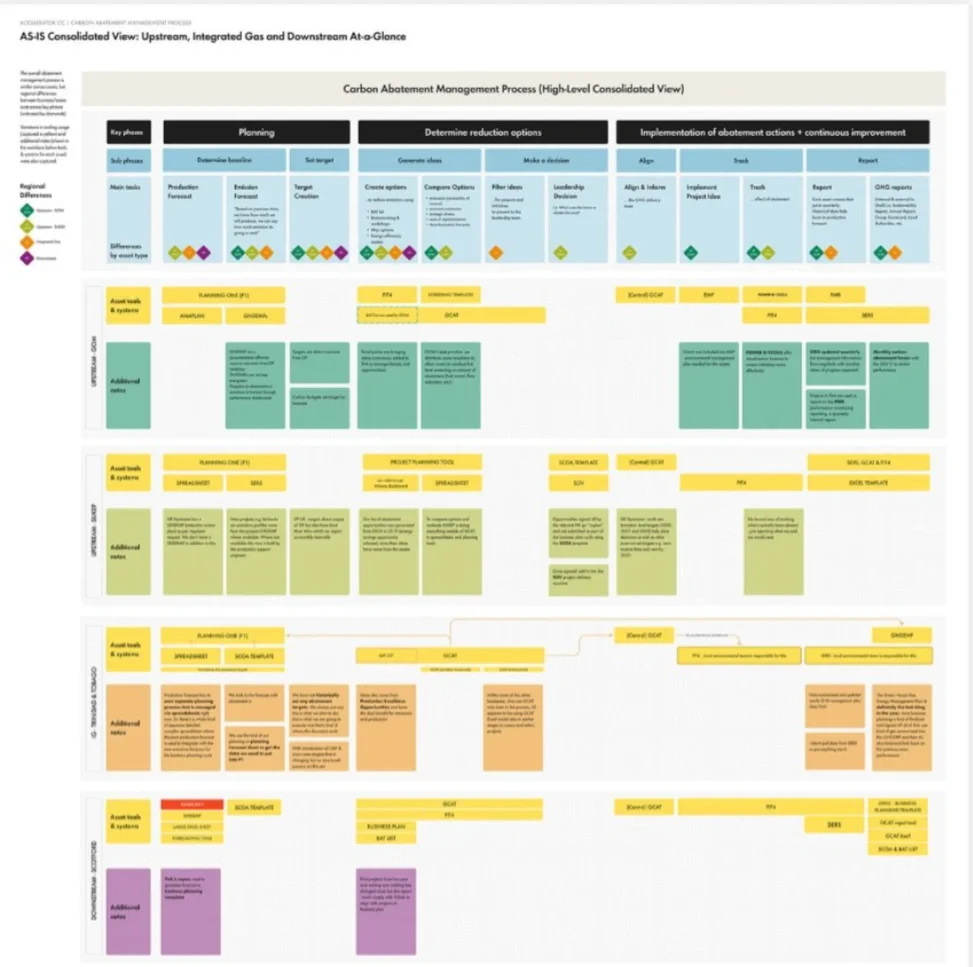 Shell's GHG management tool was used across hundreds of assets worldwide, but nobody had a clear view of the process it was supposed to support. When the team started looking at replacing it, that gap became the actual problem to solve. In two weeks, we ran 8 stakeholder interviews, 3 technical calls, and a two-part remote workshop with 18 people from Europe, the Americas, and Asia. I designed the digital boards, shaped the agenda, facilitated both sessions, and led the synthesis. What came out of it was a consolidated process map that showed, for the first time, not just how the process worked but where and why it differed across regions. Teams that had been working in isolation could suddenly see each other's processes side by side. For leadership, it made visible something that had been difficult to articulate — and gave them a clear place to start.